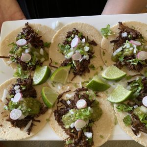 There is lots of history behind just the word “barbacoa” (it’s not originally Mexican – check out the Wikipedia article for more info) – and it is one of the earliest forms of barbecue in the Western hemisphere. In contemporary Mexico, it is a method of wood-fired slow-cooking in a pit or container that is covered with agave leaves (or banana leaves in some places), which steams or braises the meats rather than roasting. The key to barbacoa is to start with a meat that is relatively high in fat content, and has a somewhat strong flavor. In our recipe, we chose something that is easy to find, and somewhat economical (although these days, the inflation bug is hitting every part of the grocery store): Chuck roast.